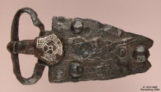 Plaque-boucle trapézoïdale en fer, à extrémité en queue d'aronde. Décor de motifs géométriques réalisés par incrustations de fils d'argent (damasquiné). Période : premier tiers du VIIe siècle apr. J.-C. Site de Cras Chalet.