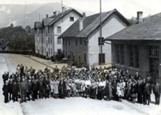 Bâtiments de la Verrerie, démolis pour faire place au nouveau bâtiment, 1943. Mémoires d'Ici. Collection privée, Musée du tour automatique et d'histoire de Moutier.Lien: http://www.agc-vim.ch/